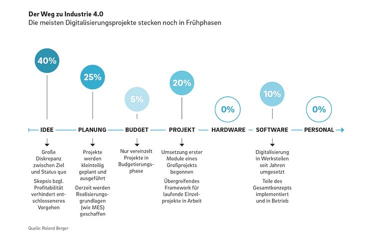 „Obwohl die Digitalisierung in den meisten deutschen Unternehmen ganz oben auf der Agenda steht, existiert die digitale Fabrik bislang erst in Ansätzen“, sagt Oliver Knapp, Partner und Leiter der Innovationsplattform "Next Generation Manufacturing" bei Roland Berger. „In den meisten Fällen sind die existierenden Anwendungen einzelfallbezogene Lösungen, entwickelt für ganz spezielle Aufgaben. Hier fehlt es an einer klaren Priorisierung und entsprechenden Strategien. Damit lassen Mittelständler Potenzial ungenutzt, ihre Abläufe zu optimieren und so ihre Position im internationalen Wettbewerb zu verbessern.“