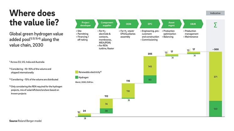 - Global schafft der Ausbau von grünem Wasserstoff eine Wertschöpfung von rund 500 Milliarden Euro bis 2030