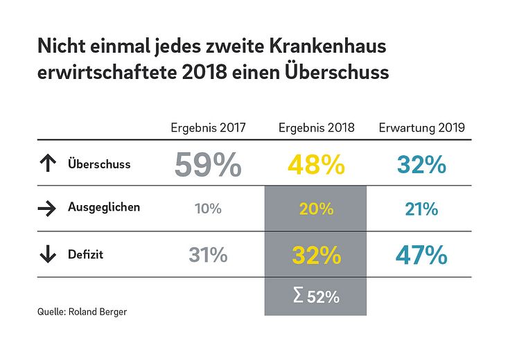 München, Juli 2019: Die Krankenhäuser in Deutschland stehen unter großem wirtschaftlichem Druck: Knapp ein Drittel schrieb 2018 Verluste, für 2019 rechnet fast jede zweite Klinik mit einem Defizit (47 Prozent) und nur noch knapp zwei Drittel (65 Prozent) erwarten steigende Umsätze. Im vergangenen Jahr waren es noch 82 Prozent.