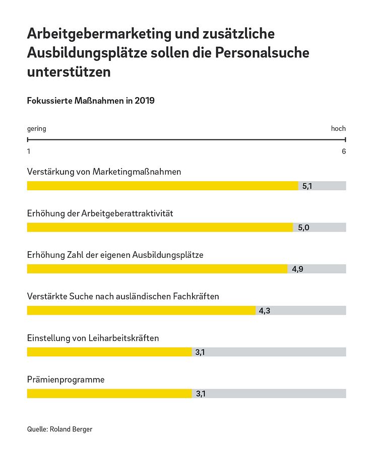 Der Fachkräftemangel betrifft sowohl kleinere Häuser in ländlichen Gebieten als auch größere mit Wachstumsambitionen. Den geplanten Stellenaufbau in der Pflege wollen sie mit vielseitigen Maßnahmen vorantreiben: "Verstärktes Marketing, attraktivere Konditionen, mehr Ausbildungsplätze sowie die Suche nach Personal aus dem Ausland stehen im Vordergrund", erklärt Oliver Rong, Partner bei Roland Berger.