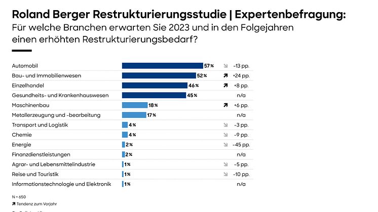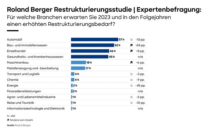 „Unsere Studie zeigt, dass die einschlägigen Experten eine regelrechte Restrukturierungswelle erwarten“, sagt Sascha Haghani, Partner und Leiter der globalen Plattform Restructuring, Performance & Transaction bei Roland Berger. „Die makroökonomischen Voraussetzungen sind schwierig: Unternehmen müssen sich auf eine Phase erhöhter konjunktureller Unsicherheit einstellen, die zusätzlich durch veränderte Rahmenbedingungen wie den Fachkräftemangel oder gestiegene Energie- und Kapitalkosten verschärft wird. Diese Gemengelage gefährdet ganze Geschäftsmodelle und verlangt nach einer grundlegenden Transformation in den Unternehmen sowie einer Aufholjagd bei technologischen Innovationen.“